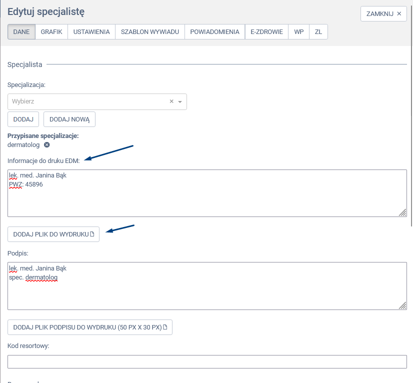 - Uzupełnienie danych do druku: W oknie „Edytuj specjalistę” masz dwie opcje do wyboru: