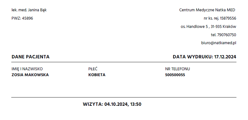 Po dokonaniu tych zmian, dane specjalisty oraz jego podpis będą widoczne w odpowiednich miejscach na wydruku dokumentacji medycznej.