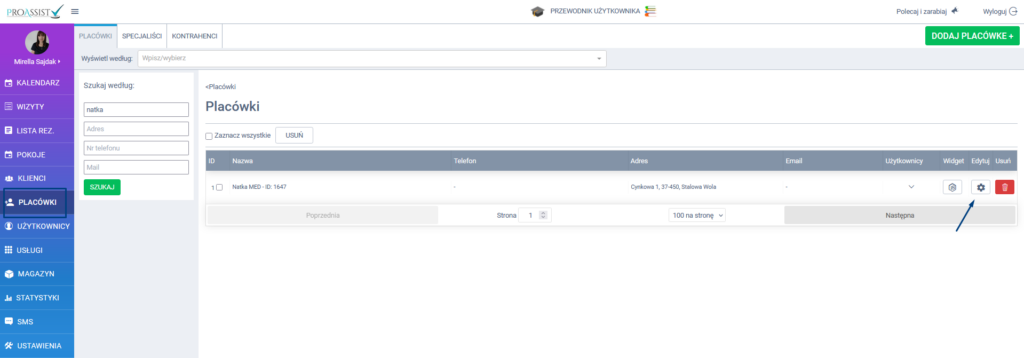 - Przejdź do zakładki Placówki w bocznym menu, a następnie kliknij ikonę edycji przy wybranej placówce.
