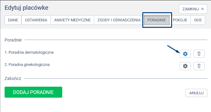 - W panelu Edytuj placówkę wybierz zakładkę Poradnie.