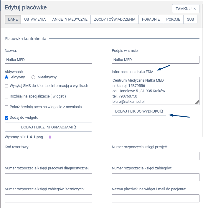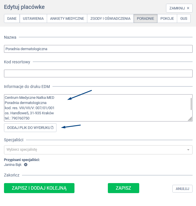 - W panelu Edytuj specjalistę, wybierz zakładkę „Dodaj plik do wydruku” i załaduj plik graficzny, który zawiera zarówno dane specjalisty, jak i dane placówki.