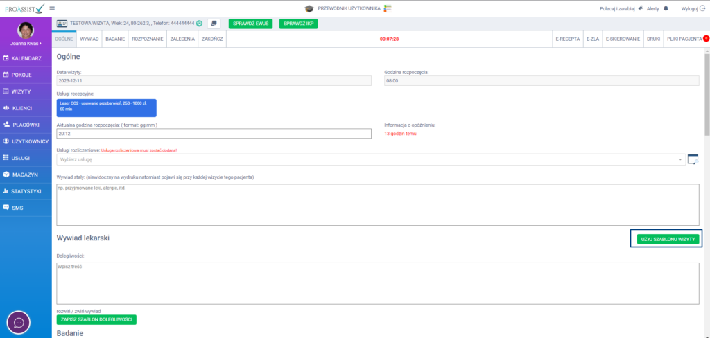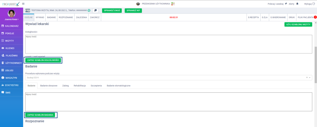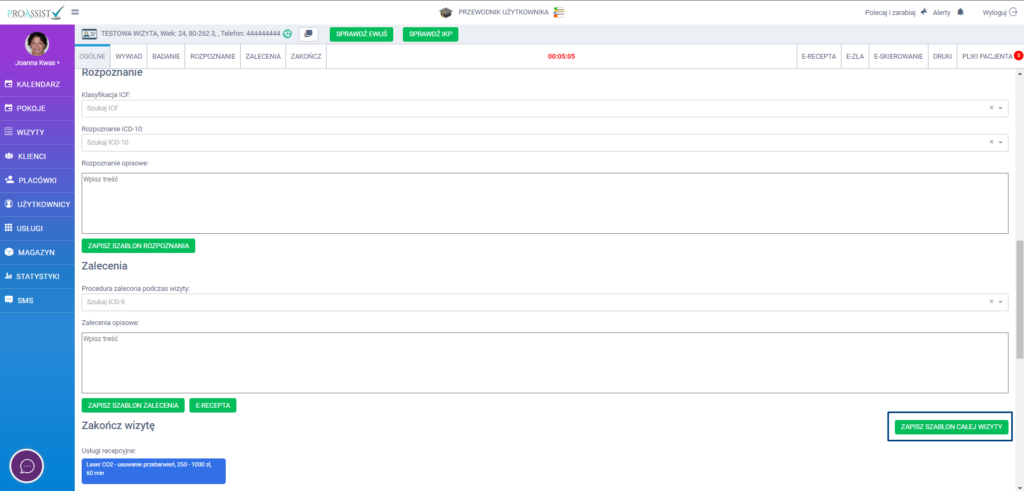 Aby zapisać szablon całej wizyty, uzupełnij odpowiednie treści w oknie przeprowadzania wizyty, a następnie kliknij w zieloną zakładkę ZAPISZ SZABLON CAŁE J WIZYTY, która znajduje się tuż obok sekcji zakończenia wizyty.