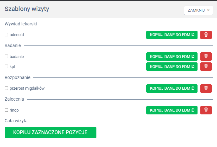 Po kliknięciu w tę zakładkę w nowym oknie dokonaj wyboru odpowiedniego szablonu, który chcesz użyć do danej wizyty poprzez kliknięcie KOPIUJ DANE DO EDM przy odpowiednim szablonie.