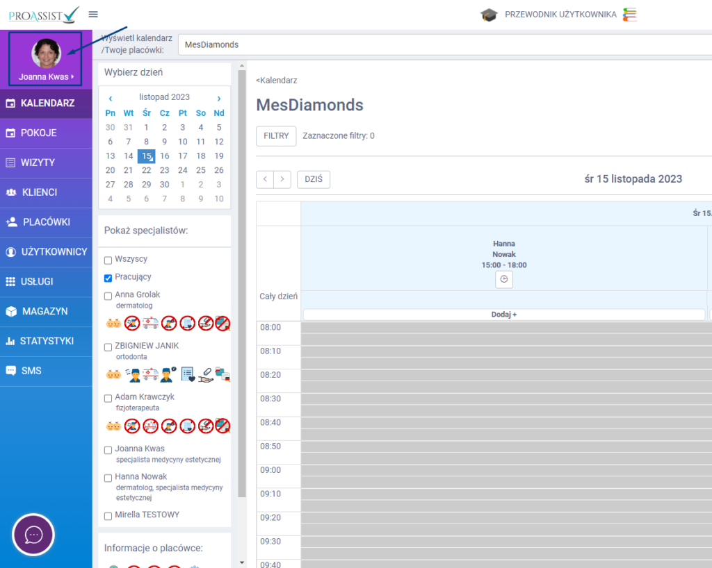 Aby ustawić zdjęcie, które będzie wyświetlało się na widgecie do rejestracji on-line każdy specjalista ze swojego konta, po zalogowaniu powinien wejść w swoje ustawienia. W tym celu kliknij w miejsce na awatar w lewym górnym rogu nad nazwą konta.