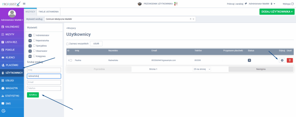 Z menu głównego wybierz zakładkę Użytkownicy. Znajdź na liście konkretnego specjalistę i kliknij przy nim przycisk Edycja. W wyszukaniu odpowiedniej osoby, może posłużyć Ci wyszukiwarka – wpisz dane specjalisty, a następnie kliknij w zakładkę SZUKAJ.