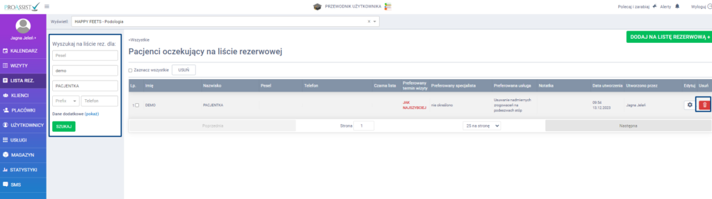 By usunąć wpis z listy rezerwowej w pierwszej kolejności wyszukaj interesującego Cię pacjenta. W tym celu skorzystaj z wyszukiwarki, która znajduje się po lewej stronie listy oczekujących pacjentów. Przy konkretnej osobie kliknij w ikonę kosza.