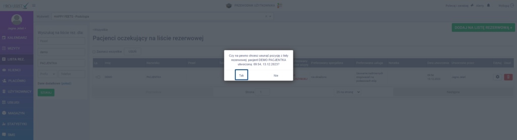 System wyświetli dodatkowy komunikat, który chroni przed przypadkowym usunięciem wpisu. Jeżeli chcesz usunąć dany wpis z listy, kliknij w opcję Tak.