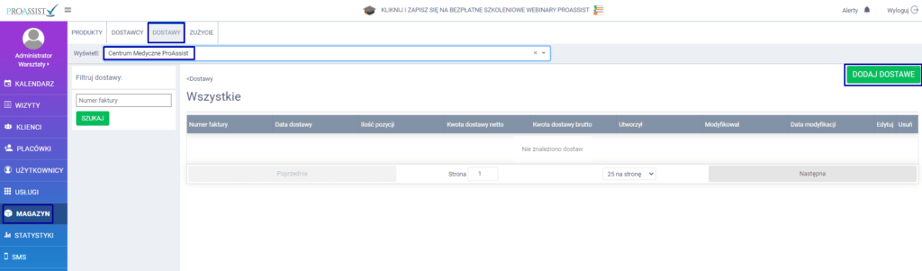 Przejdź do zakładki MAGAZYN, z górnego menu wybierz zakładkę DOSTAWY, a następnie wybierz placówkę z listy. Kliknij w zieloną zakładkę DODAJ DOSTAWE.