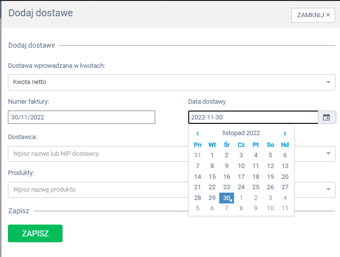 W panelu bocznym uzupełnij odpowiednio formularz. Określ rodzaj kwot, w których wprowadzasz dostawę: netto czy brutto. Wpisz numer faktury dostawy oraz określ datę dostawy. Defaultowo data dostawy jest datą bieżącą – możesz dokonać modyfikacji, wybierając nową datę z kalendarza.