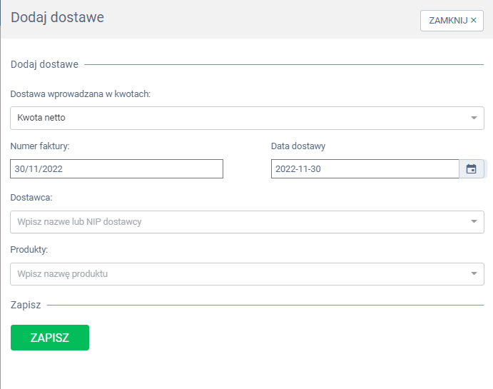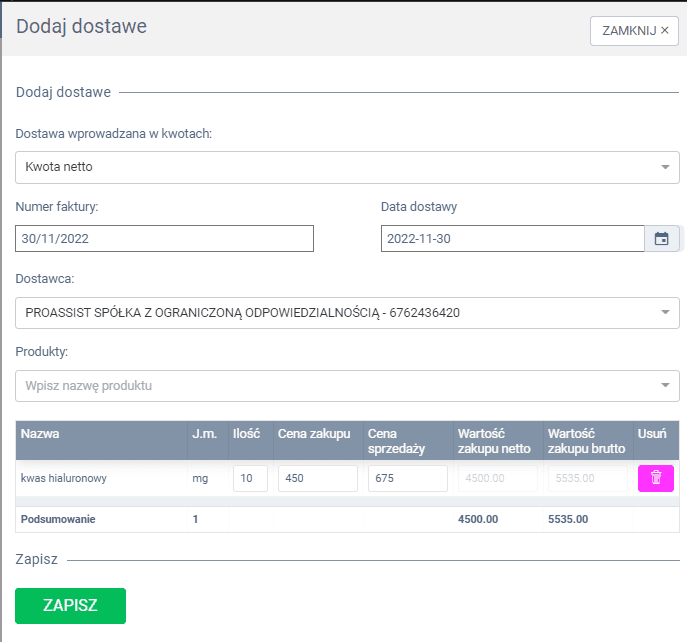 Proces wprowadzania dostawy zakończ poprzez kliknięcie w zieloną zakładkę ZAPISZ.