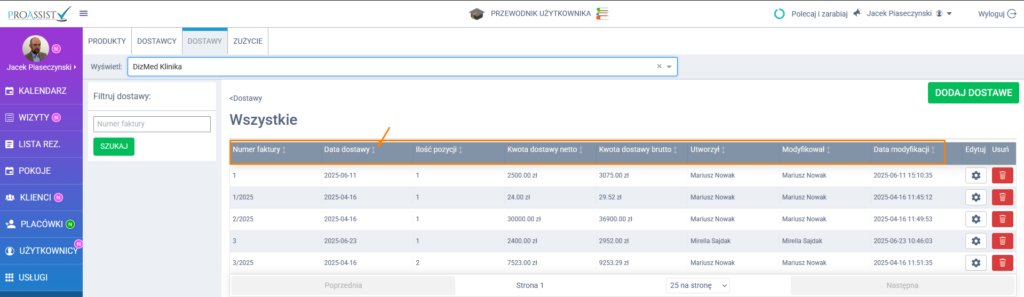 2. System automatycznie posortuje i wyświetli listę dostaw zgodnie z wybranym kryterium (rosnąco lub malejąco).