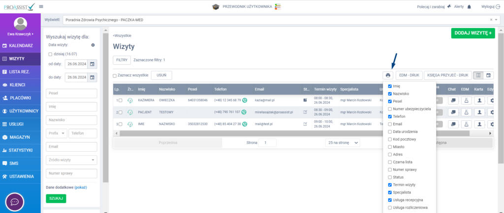 Gdy system wyświetli już odpowiednio posegregowaną listę wizyt za dany okres, kliknij ikonkę drukarki znajdującą się po prawej stronie powyżej listy wizyt. Na liście rozwijanej określ jakie informacje mają pojawić się na danym wydruku, zaznaczając/odznaczając odpowiednie checkboxy. Gdy ustawisz już odpowiednie dane, kliknij w drukuj.
