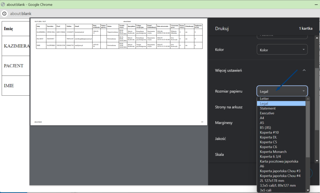 W oknie drukowania wybierz odpowiednią drukarkę. W przypadku, gdy ustawisz wydruk tabeli wizyt składającej się z wielu kolumn, zalecamy:
