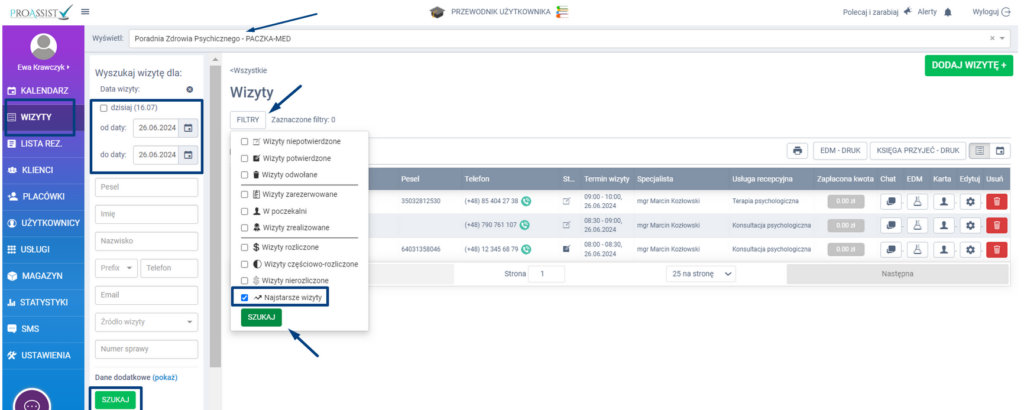 W kolejnym kroku wybierz zakładkę FILTRY. Na liście, która wyświetli się po kliknięciu w filtry wybierz opcję NAJSTARSZE WIZYTY, by uporządkować je chronologicznie. Swoje wyszukiwania zatwierdź za pomocą zielonej zakładki SZUKAJ.