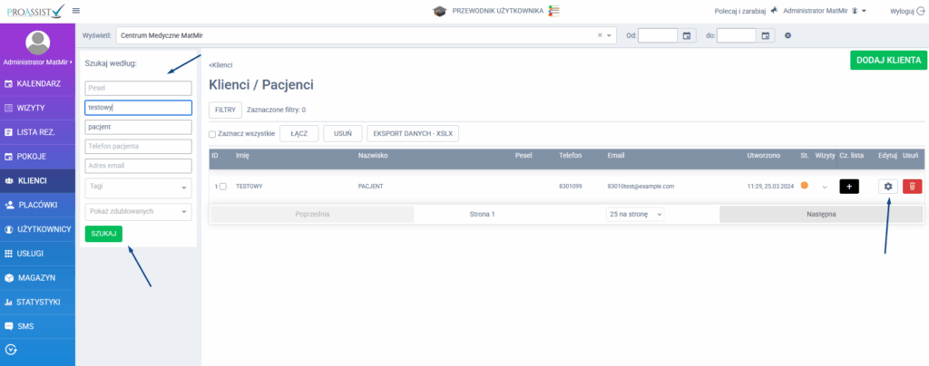 - Wyszukaj pacjenta i kliknij przycisk Edytuj.