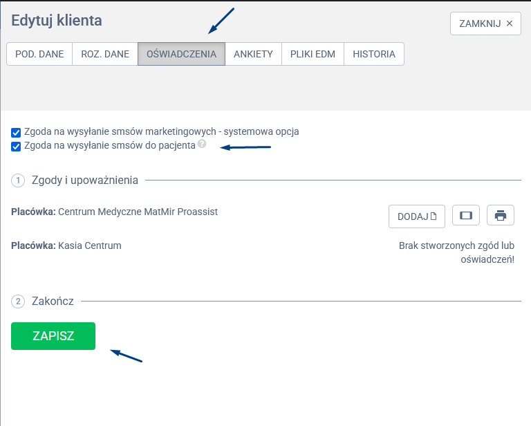 ✅ Zgoda na wysyłanie SMS-ów do pacjenta