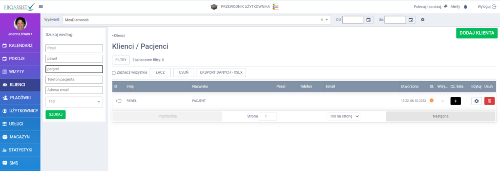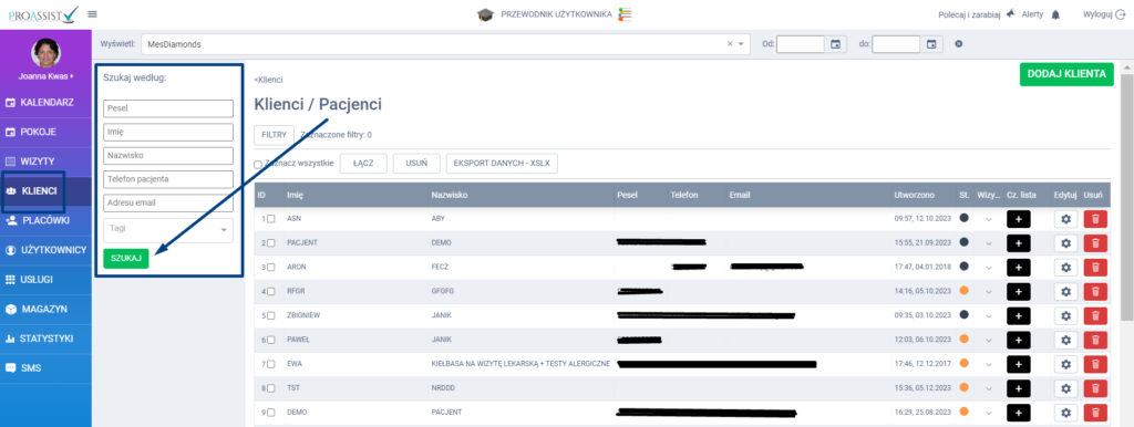 Aby wyszukać odpowiedniej karty w systemie, przejdź do zakładki KLIENCI z bocznego menu. Skorzystaj z wyszukiwarki, wprowadzając odpowiednie dane. Po wpisaniu danych, kliknij w zieloną zakładkę SZUKAJ, aby system mógł wyświetlić odpowiednie wyniki.