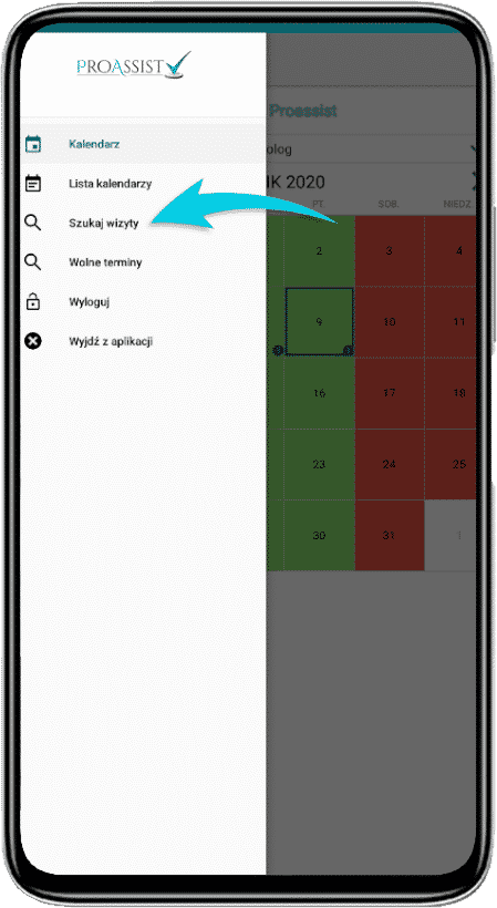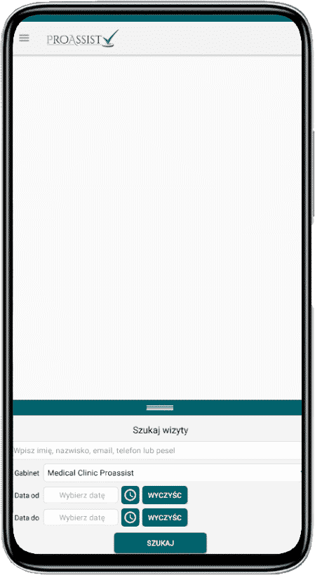 Aby wyszukać wizytę dotknij ikonkę trzech pasków w lewym górnym rogu. W panelu wyskakującym z lewej strony ekranu wybierz „Szukaj wizyty”. Wpisz imię, nazwisko, e-mail, telefon lub pesel pacjenta, którego wizytę chcesz wyszukać. Daną wizytę możesz także wyszukać wybierając placówkę lub datę. Dotknij SZUKAJ.