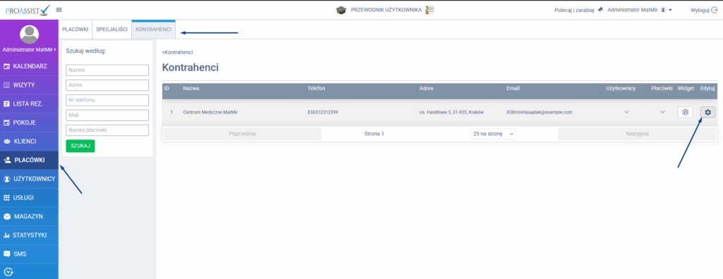 - Przejdź do menu Placówki > Kontrahenci.