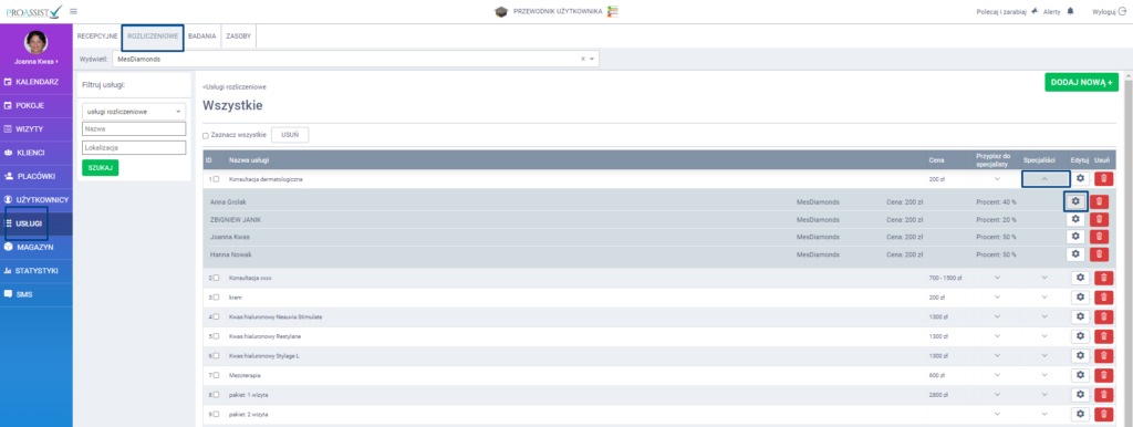 Jeżeli chcesz dokonać zmiany ceny usługi rozliczeniowej w tym celu z bocznego menu wybierz USŁUGI, w panelu górnym wybierz ROZLIZENIOWA, wyszukaj odpowiedniej usługi, a następnie kliknij „v” na liście w sekcji „Specjaliści” przy usłudze, której cenę chcesz zmienić. Teraz kliknij ikonkę edycji przy konkretnym specjaliście.