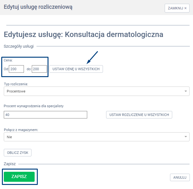 Możesz od razu dokonać zmiany u wszystkich specjalistów, którzy wykonują tę usługę, w tym celu kliknij w opcję USTAW CENĘ U WSZYSTKICH. Na koniec zatwierdź wprowadzone zmiany klikając ZAPISZ.