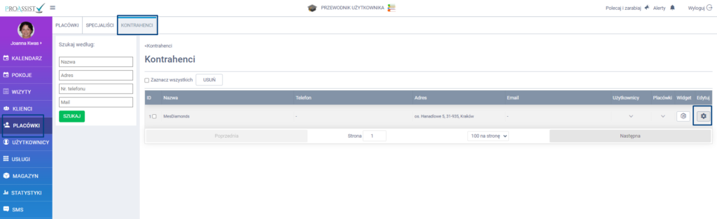 Aby skonfigurować opcję Click to Call w systemie Proassist wybierz PLACÓWKI z bocznego menu, a następnie kliknij górną zakładkę KONTRAHENCI. Kliknij ikonkę edycji przy kontrahencie.