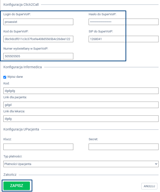W panelu edycji przesuń suwak w dół do sekcji “Konfiguracja Click2Call”. Wypełnij pola wyżej wymienionymi danymi. Zatwierdź zmiany klikając ZAPISZ.
