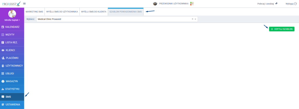 Z panelu bocznego przejdź do zakładki SMS, a następnie SZABLON POWIADOMIENIA SMS. Jeśli posiadasz kilka placówek, w sekcji Wybierz określ placówkę, dla której chcesz zmodyfikować treść wiadomości. W kolejnym kroku kliknij w zieloną zakładkę + EDYTUJ SZABLON.