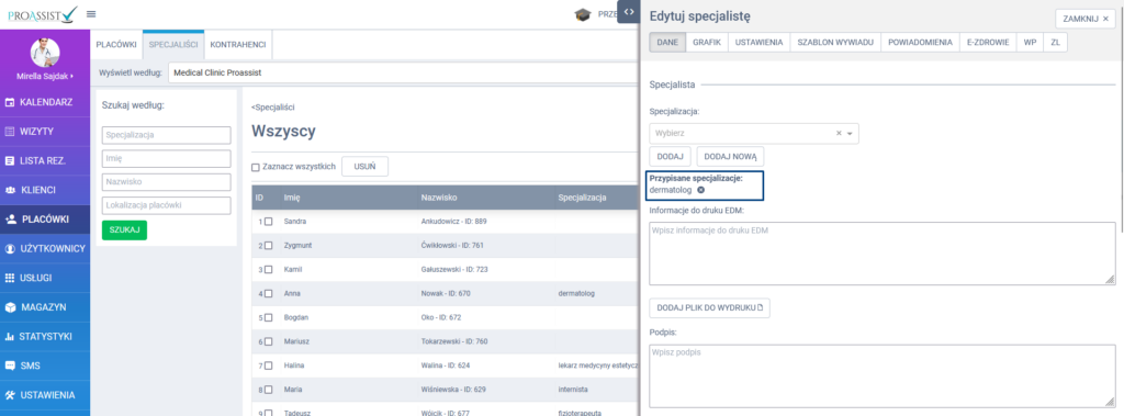 • specjalizacja specjalisty -> informacje te pobierane są z pola Przypisane specjalizacje, które jest dostępne w edycji specjalisty