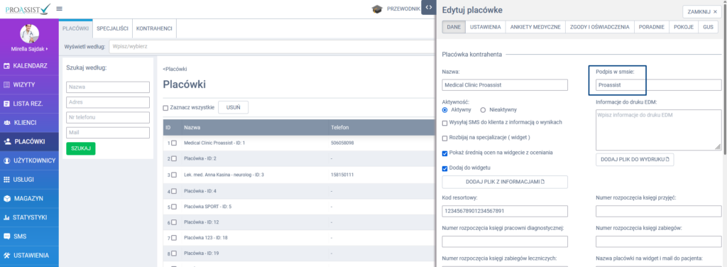 • podpis w smsie -> informacje pobierane z pola Podpis w smsie, które jest dostępne w edycji placówki