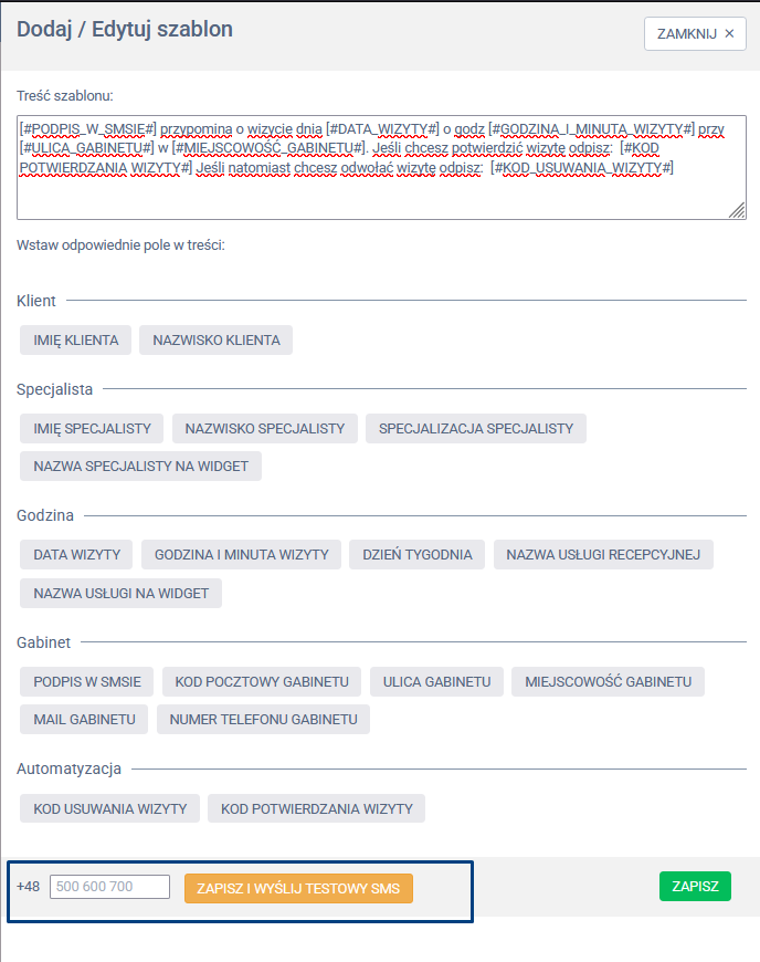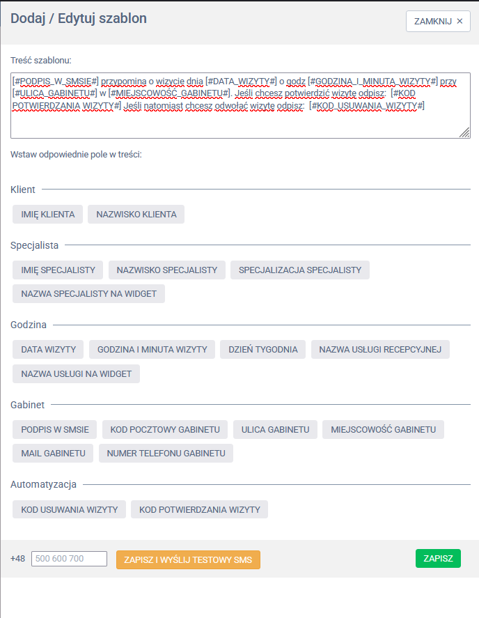 Te zmienne pozwalają na dynamiczne tworzenie wiadomości SMS, które automatycznie dostosowują się do danych pacjenta, specjalisty oraz rezerwacji, dzięki czemu każda wiadomość jest spersonalizowana.