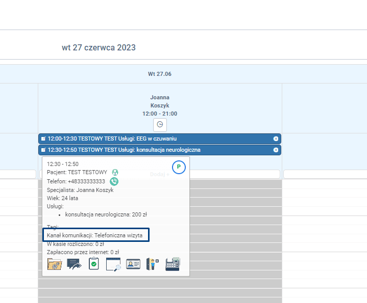 Po dokonanej rezerwacji, każdy użytkownik systemu ma podgląd pod wybrany kanał komunikacji do konkretnej wizyty. W oknie informacyjnym do wizyty pojawia się informacja na temat kanału komunikacji wybranego w trakcie zapisu na wizytę. Dzięki temu specjalista będzie wiedział w jakiej formie powinien kontaktować się z pacjentem w ramach wizyty.