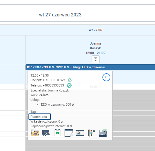 Dodatkowo każdy użytkownik ma podgląd do informacji w ramach jakiego płatnika dany pacjent ma być przyjęty przez specjalistę. W oknie informacyjnym do wizyty pojawia się informacja na temat płatnika wybranego w trakcie zapisu na wizytę.