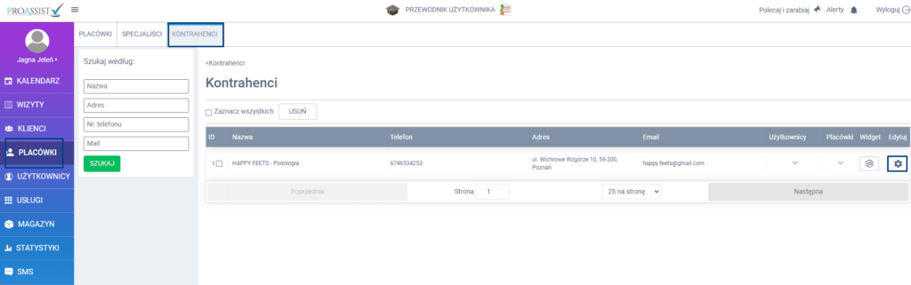 Aby uruchomić model zapisu z rezerwacjami w tym celu z bocznego menu kliknij w zakładkę PLACÓWKI, z górnego menu wybierz zakładkę KONTRAHENCI, a następnie ikonę edycji przy konkretnym kontrahencie.