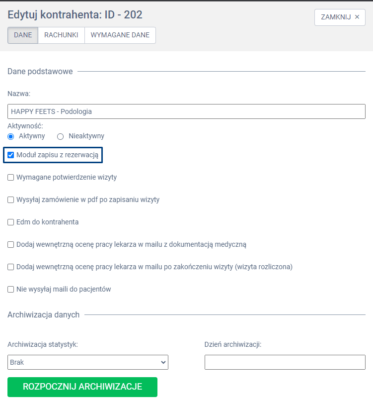 W panelu bocznym wysuwanym zaznacz opcję MODUŁ ZAPISU Z REZERWACJĄ. Wprowadzone dane zatwierdź poprzez kliknięcie w zieloną zakładkę ZAPISZ.