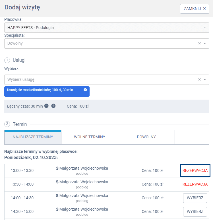 – rezerwacja dokonywana w panelu – nie pokazuje terminu wyświetlanego na widgecie rejestracji online (blokada terminu na okres 3 minut)