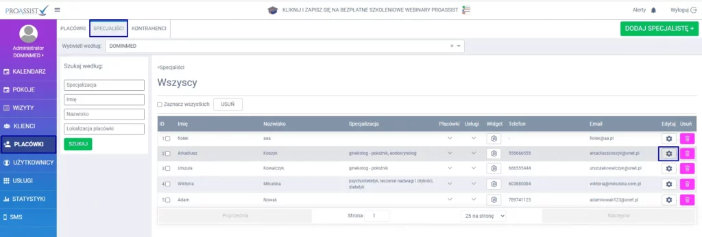Nałożenie limitu możesz również dokonać z pozycji grafiku stałego, tj. w ustawieniach konkretnego specjalisty. W tym celu z bocznego menu kliknij w zakładkę PLACÓWKI, z górnego w zakładkę SPECJALIŚCI, a następnie kliknij w ikonę edycji przy konkretnym specjaliście.