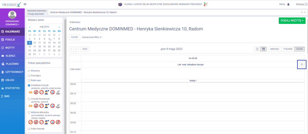 W celu dodania limitu na konkretną usługę w wybranym dniu, kliknij z pozycji kalendarza w dany dzień, a następnie w ikonę zegara