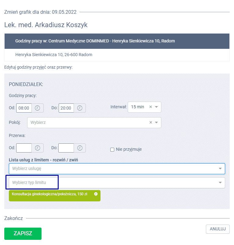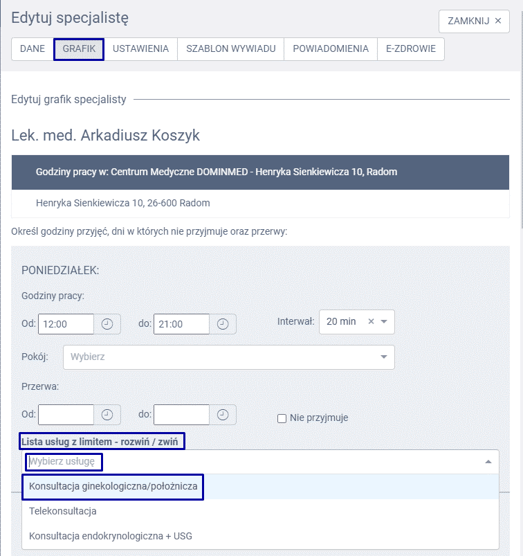2. Dodanie limitu ilościowego na konkretnego usługę w grafiku stałym