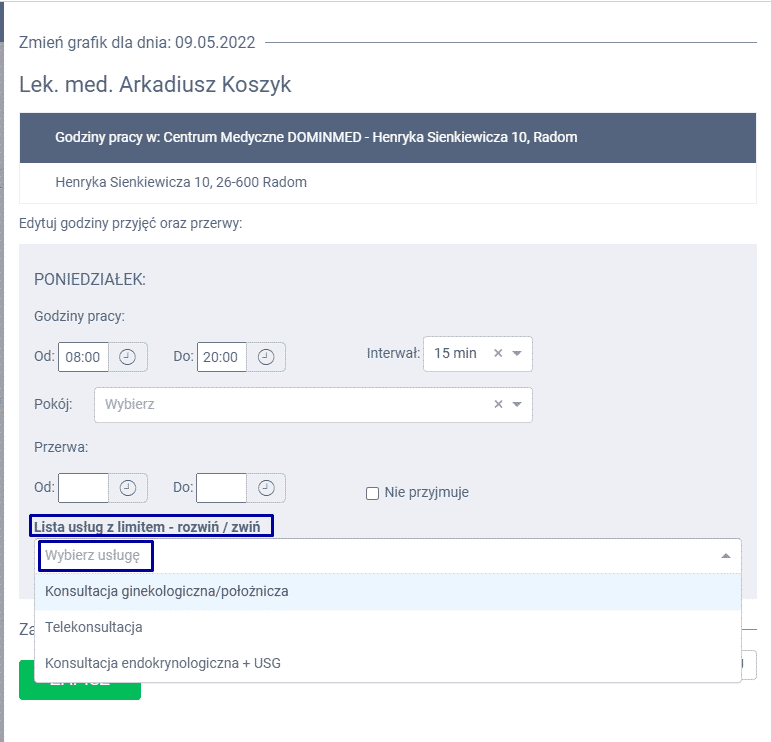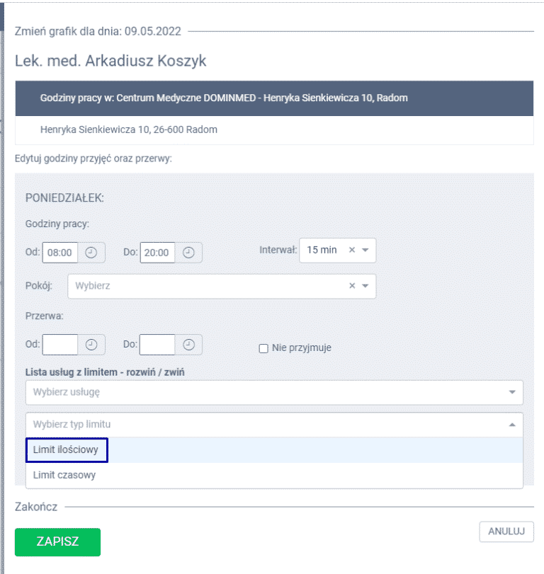 1. Dodanie limitu ilościowego na konkretnego usługę w grafiku elastycznym/zmiennym