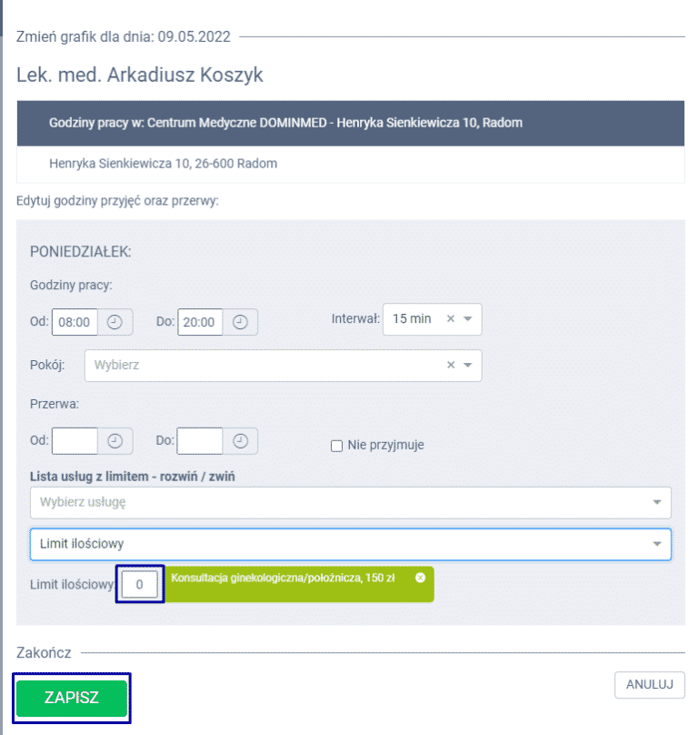 Jeżeli chcesz, aby pacjent nie miał możliwości zapisu w ciągu dnia na tę usługę, pozostaw 0. Jeżeli chcesz umożliwić pacjentowi zapisać na tę usługę w wybranym dniu w ograniczonych ilościach – wpisz odpowiednią liczbę, która będzie oznaczała maksymalną ilość zapisanych wizyt w ciągu dnia dla tej konkretnie usługi.