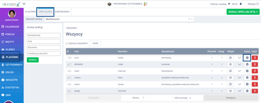 Aby ustawić odpowiedni poziom refundacji z konta administratora, w tym celu z bocznego menu wybierz zakładkę PLACÓWKI, a następnie z górnego menu zakładkę SPECJALIŚCI. Na liście specjalistów, kliknij w ikonę edycji przy konkretnej osobie.