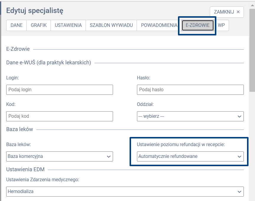 W panelu bocznym wysuwanym wybierz zakładkę E-ZDROWIE. W kolejnym kroku w sekcji “Ustawienie poziomu refundacji w recepcie” wybierz odpowiedni selekt.