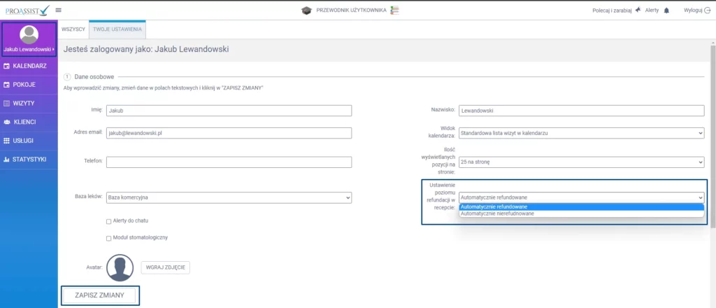 Aby ustawić odpowiedni poziom refundacji, w tym celu z konta specjalisty kliknij w swój avatar, a następnie w oknie ustawień w sekcji “Ustawienie poziomu refundacji w recepcie” wybierz odpowiedni selekt. Wprowadzone zmiany zatwierdź klikając w zakładkę ZAPISZ ZMIANY.