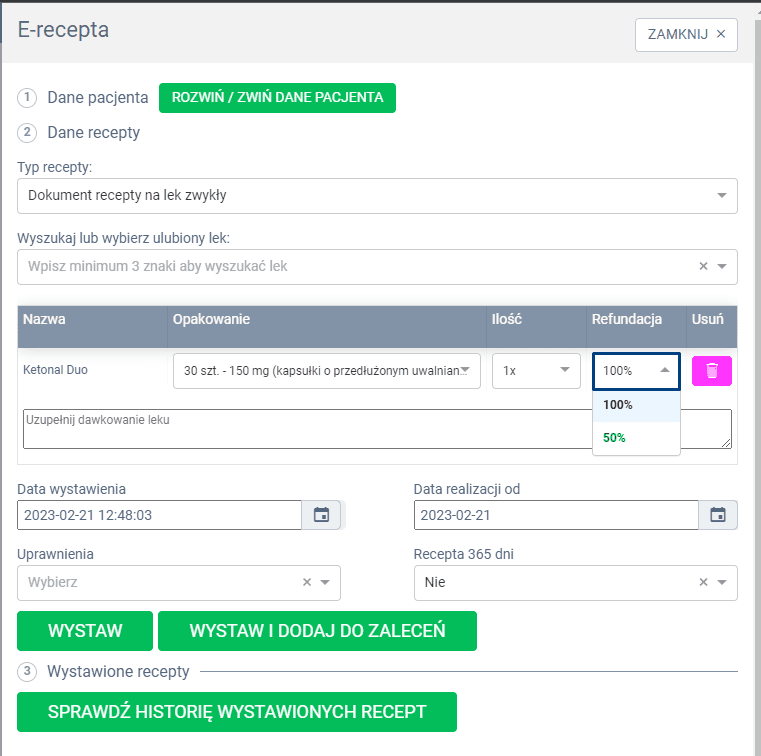 Możliwość ustawienia poziomu refundacji w wystawionej recepcie #