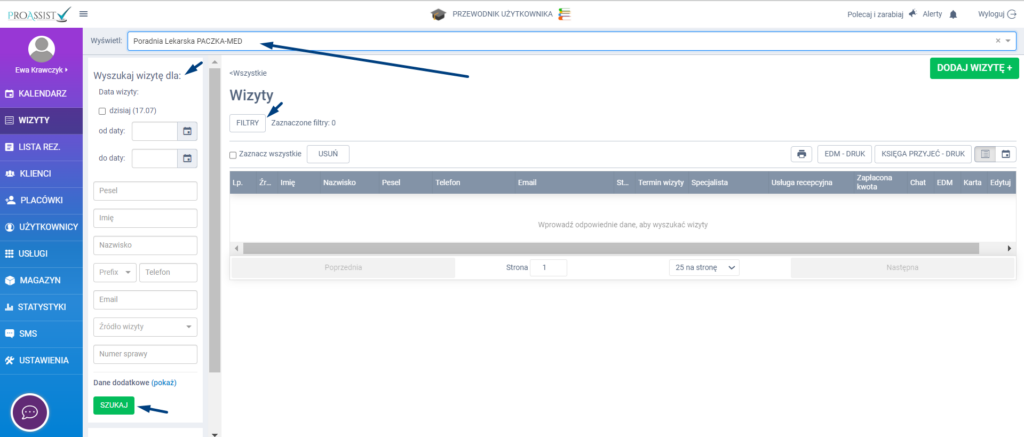 - Po ustawieniu odpowiednich filtrów należy kliknąć przycisk „SZUKAJ”, aby system rozpoczął wyszukiwanie i wyświetlił listę wizyt.