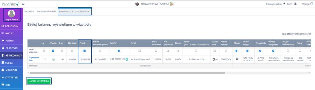 W tym celu z bocznego menu kliknij w swój avatar (górny, lewy róg z Twoimi danymi). W kolejnym kroku wybierz zakładkę PERSONALIZACJA TABELI WIZYT i zaznacz odpowiednie checkboxy z informacjami, które chcesz aby były wyświetlane w poszczególnych kolumnach tabeli w zakładce WIZYTY. Wprowadzone dane zatwierdź poprzez kliknięcie w zieloną zakładkę ZAPISZ USTAWIENIA.