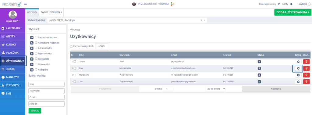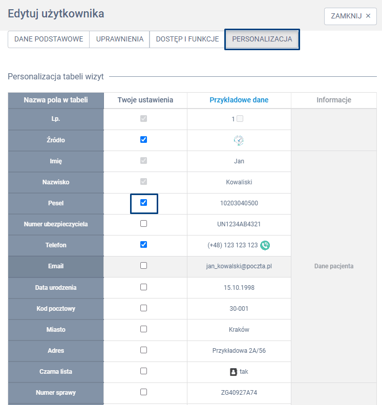 Jako administrator systemu możesz dokonać personalizacji tabeli wizyt za danego użytkownika. W tym celu z bocznego menu kliknij w zakładkę UŻYTKOWNICY, w kolejnym kroku wyszukaj odpowiedniej osoby, której chcesz spersonalizować tabelę, kliknij ikonę edycji przy jego danych. W panelu bocznym wysuwanym wybierz zakładkę PERSONALIZACJA i zaznacz odpowiednie checkboxy z informacjami, które chcesz aby były wyświetlane dla tego użytkownika w poszczególnych kolumnach tabeli w zakładce WIZYTY. Wprowadzone dane zatwierdź poprzez kliknięcie w zieloną zakładkę ZAPISZ