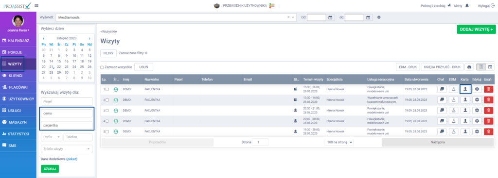 Wybierz z bocznego menu zakładkę WIZYTY, a następnie wyszukaj danego pacjenta. W kolejnym kroku wybierz Karta pacjenta.