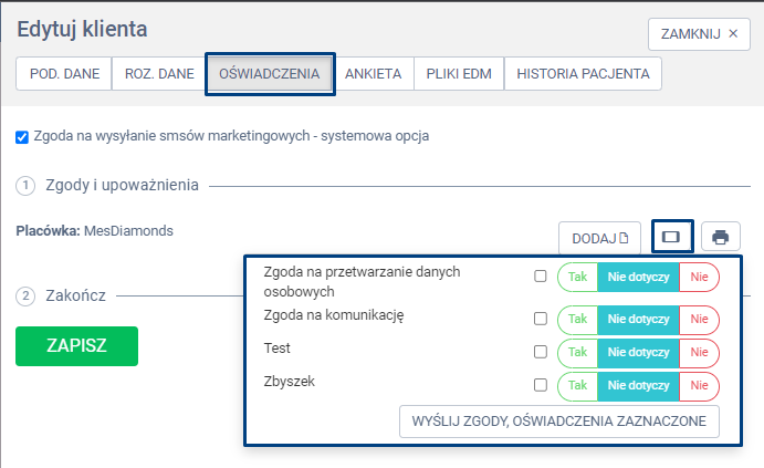 W zakładce oświadczenia wybierz ikonę “Wybierz druk zgody lub oświadczenia do wygenerowania i druku”, zaznacz zgody i oświadczenia, a następnie zatwierdź klikając wyślij zgody, oświadczenia zaznaczone.